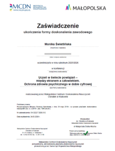 24 marca uczestniczyłam online w konferencji zorganizowanej przez MCDN Małopolska pod tytułem „Uczeń w świecie powiązań – między ekranem a człowiekiem. Ochrona zdrowia psychicznego w dobie cyfrowej”. Dla mnie, jako autorki książki o Wifiku i Mikołaju, która uczy dzieci bezpieczeństwa w sieci, był to czas słuchania z notatnikiem w ręku i z niejedną myślą o tym, co piszę i dla kogo.